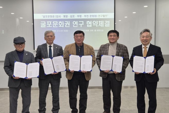 경기호연뉴스 민선기 기자 | 부천문화원과 강서문화원, 계양문화원, 김포문화원, 부평문화원은 3월 4일 부천문화원에서 ‘굴포문화권’을 토대로 하는 연구교류 협약식을 체결했다. 이로써 ‘굴포’를 같은 문화권으로 하는 부천문화원·강서문화원·계양문화원·김포문화원·부평문화원은 학술대회와 콘텐츠 발굴 사업 등 다양한 지역학 자원을 발굴하고 활성화하기 위해 최초로 지역학 연구 모델을 구축하게 됐다. 특히, 이번 협약은 경기도(부천, 김포), 서울특별시(강서), 인천광역시(계양, 부평)를 잇는 ‘지역학’ 중심의 연구 교류를 마련한다는 점에서 주목된다.