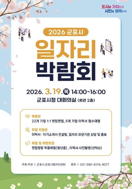 경기호연뉴스 민선기 기자 | 군포시는 오는 3월 19일 오후 2시부터 시청 대회의실에서 ‘2026년 군포시 일자리 박람회’를 개최한다. 이번 박람회는 지역 내 우수 기업과 구직자가 직접 만나는 채용의 장으로 제조, 서비스, 물류배송, 의료복지 등 다양한 분야에서 폭넓은 취업 기회를 제공할 예정이다.