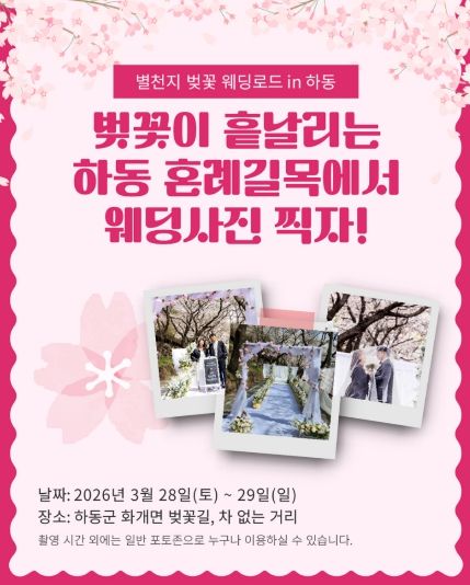 참가 신청은 3월 15일까지이며, 신청자가 많으면 조기 마감될 수 있다. 희망자는 하동군청 홈페이지 배너에 게시된 구글폼을 통해 촬영 희망 일자와 함께 사연을 제출하면 된다.