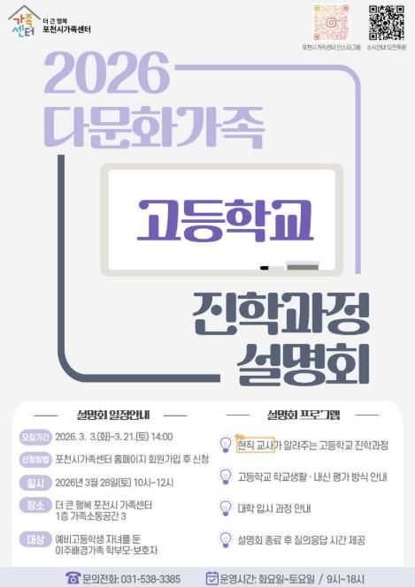 경기호연뉴스 민선기 기자 | 포천시 직영 더 큰 행복 포천시가족센터가 오는 28일, '2026 다문화가족 고등학교 진학과정 설명회'를 개최한다.