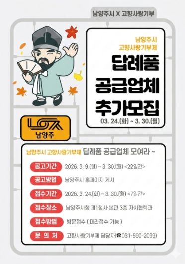 경기호연뉴스 민선기 기자 | 남양주시는 오는 3월 24일부터 고향사랑기부제 참여자들에게 제공할 ‘2026년 고향사랑기부제 답례품 공급업체’ 추가 모집 접수를 시작한다고 6일 밝혔다.