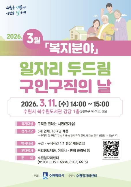 경기호연뉴스 민선기 기자 | 수원특례시는 3월 11일 오후 2시부터 3시까지 북수원도서관 강당에서 ‘3월 일자리 두드림 구인·구직의 날’을 개최한다.