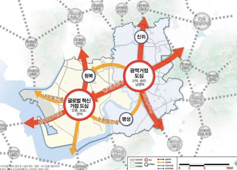 동부 생활권은 첨단산업과 연구개발, 국제교류 기능을 중심으로 경쟁력을 강화하고, 서부 생활권은 평택항과 연계한 물류, 수소산업, 해양관광 기능을 중심으로 육성할 계획이다. 각 권역의 특성을 살리면서도 상호 연계되는 발전체계를 구축해 특정 지역에 기능이 집중되지 않도록 하고, 평택 전역의 동반성장을 유도한다는 방침이다.