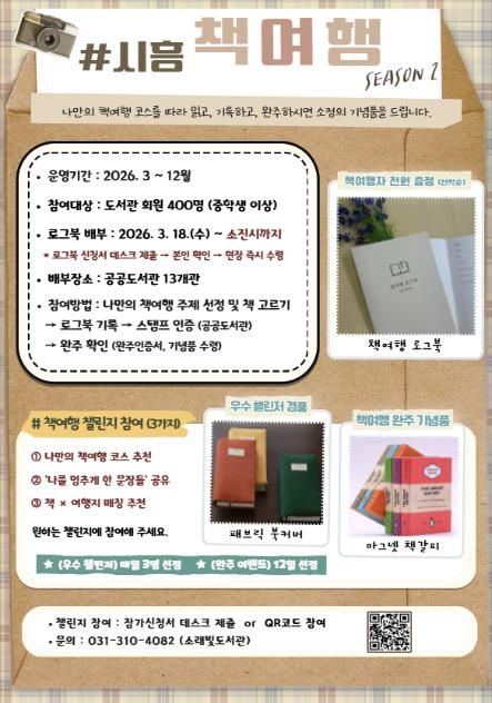 경기호연뉴스 민선기 기자 | 시흥시도서관은 시민의 독서 실천을 지원하고 일상 속 독서문화를 확산하기 위해 3월 18일부터 ‘2026 시흥 책여행(시즌2)’ 로그북을 배부하고, ‘책여행 로그북 챌린지’를 함께 운영한다.
