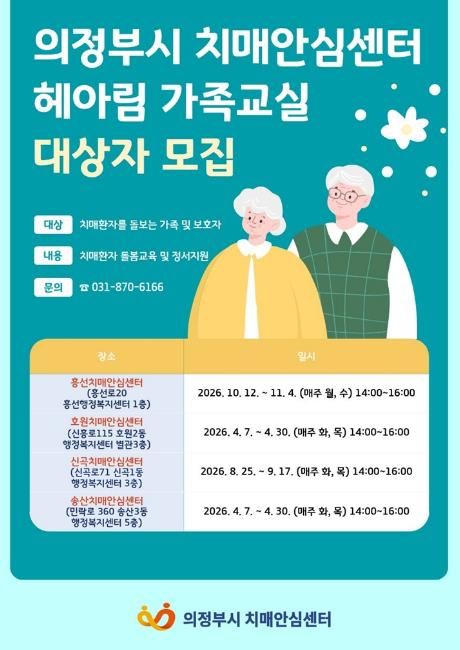 경기호연뉴스 민선기 기자 | 의정부시 보건소 치매안심센터는 4월부터 치매환자 가족과 보호자의 돌봄 부담을 경감하고 정서적 지지를 돕기 위한 가족지원 프로그램 ‘기억돌봄교실’을 운영한다.