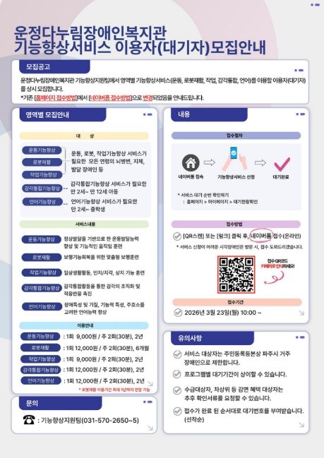 경기호연뉴스 민선기 기자 | 파주시 운정다누림장애인복지관은 지역 내 장애인의 기능 향상과 일상생활 능력 증진을 위해 ‘기능향상서비스’참여자를 오는 23일부터 상시 모집한다.