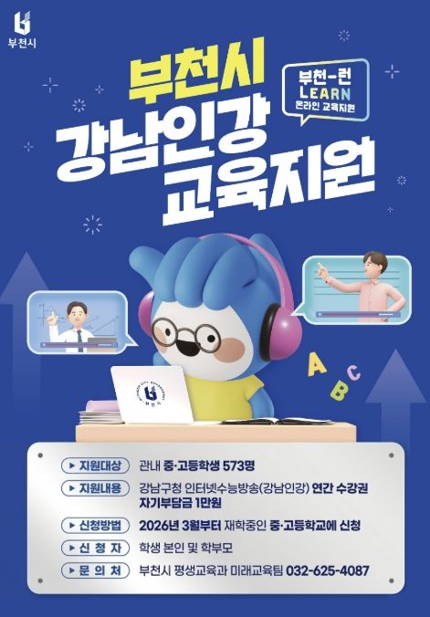 경기호연뉴스 민선기 기자 | 부천시는 2026년 ‘부천-런(Learn) 온라인 교육지원’ 사업을 추진한다고 19일 밝혔다. 이는 지난해에 이어 시행되는 것으로, 관내 중·고등학생들에게 온라인 교육 기회를 제공하고 가정의 사교육비 부담을 완화하는 데 중점을 둔다.