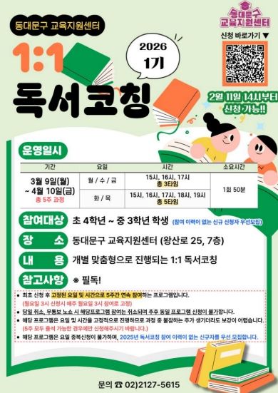 경기호연뉴스 민선기 기자 | 서울 동대문구가 학생 맞춤형 독서교육 프로그램인 ‘2026년 상반기 1:1 독서코칭’을 운영한다.