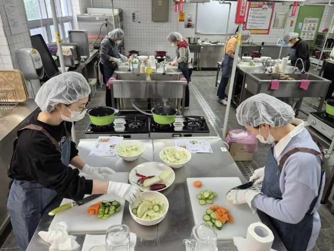 연수 과정은 △학교급식의 이해 및 위생교육 △조리실 현장 적응 및 조리 실습으로 구성됐다. 특히 조리실습에서는 단체급식의 기본이 되는 채소 전처리와 칼을 사용한 썰기 방법을 집중적으로 익히며, 급식 현장에서 바로 활용할 수 있는 기초 조리 기술을 습득하는 시간을 가졌다. 또한 실습에 사용한 식재료를 활용해 피클을 직접 만들어 보는 과정으로 진행하여 연수 참여자들이 조리 과정의 성취감을 느끼고 직무에 대한 긍정적인 인식을 높일 수 있도록 했다.