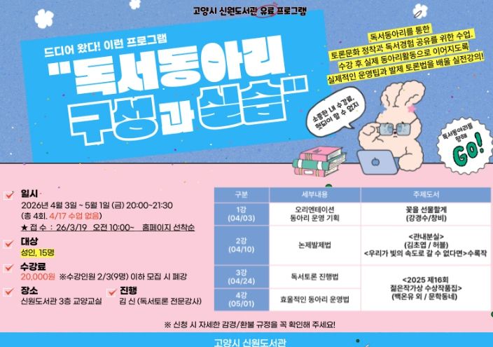 경기호연뉴스 민선기 기자 | 고양특례시 신원도서관은 논제 발제법과 독서동아리 운영법을 다루는 실전형 강의 ‘독서동아리 구성과 실습’을 오는 4월 도서관 3층 교양교실에서 진행한다.