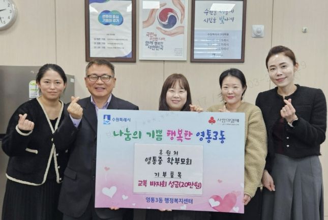 김인태 영통3동장은 “지역사회를 위해 따뜻한 나눔을 실천해주신 영통중 학부모회에 깊이 감사드리며, 전달받은 성금은 도움이 필요한 이웃에게 소중히 전달하겠다”고 감사의 뜻을 밝혔다.