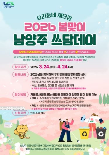 경기호연뉴스 민선기 기자 | 남양주시는 3월 24일부터 4월 24일까지 시 전역에서‘우리동네 새단장 봄맞이 남양주 쓰담데이’집중 추진기간을 운영한다고 밝혔다.