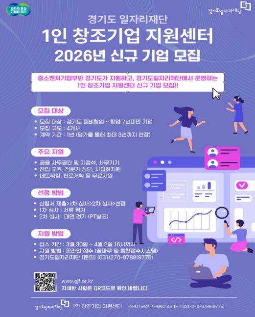 경기호연뉴스 민선기 기자 | 경기도일자리재단은 창업자와 예비 창업자에게 사무공간과 사업화를 지원하는 ‘1인 창조기업 지원센터’ 참여기업을 30일부터 모집한다.