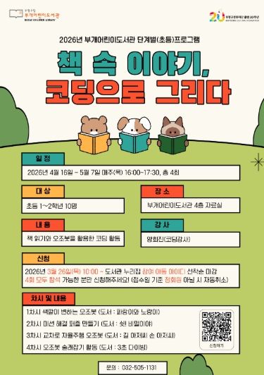 먼저, 초등 저학년을 대상으로 하는 ‘책 속 이야기, 코딩으로 그리다’ 프로그램은 4월 16일부터 5월 7일까지 매주 목요일 오후 4시, 총 4회 운영된다. 그림책을 함께 읽고 초소형 교육용 로봇(오조봇, Ozobot)을 활용한 코딩 체험을 통해 문제해결 능력과 창의력을 기를 수 있도록 기획됐다.