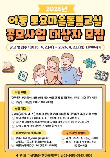 경기호연뉴스 민선기 기자 | 광명시 광명6동 행정복지센터는 오는 21일까지 ‘2026년 아동 토요마을돌봄교실 공모사업’에 참여할 주민 가족 모임 20개 팀을 모집한다.