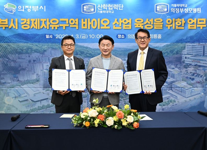 경기호연뉴스 민선기 기자 | 의정부시는 4월 3일 시청 회룡홀에서 가톨릭대학교 의정부성모병원, 가톨릭대학교 산학협력단과 함께 ‘의정부시 경제자유구역 바이오 산업 육성을 위한 업무협약’을 체결했다.