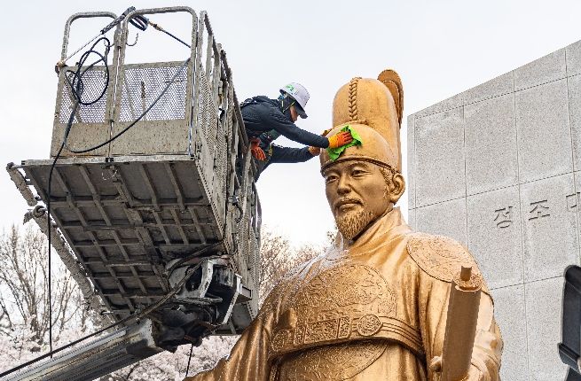 정조대왕 동상에 겨우내 쌓인 먼지와 오염물질을 고압세척기로 제거하고, 산화된 부분도 깨끗하게 정비했다. 물과 중성세제를 혼합한 세척액을 사용해 동상 표면을 청소하고, 부드러운 천으로 닦아 먼지와 녹을 말끔하게 제거했다.