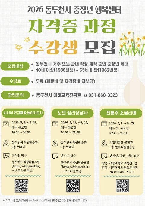 경기호연뉴스 민선기 기자 | 동두천시 미래교육진흥원은 지역 내 중장년층의 성공적인 인생 2막과 안정적인 사회 참여를 지원하기 위해 ‘2026년 중장년 행복센터 자격증 과정’ 수강생을 모집한다고 밝혔다.