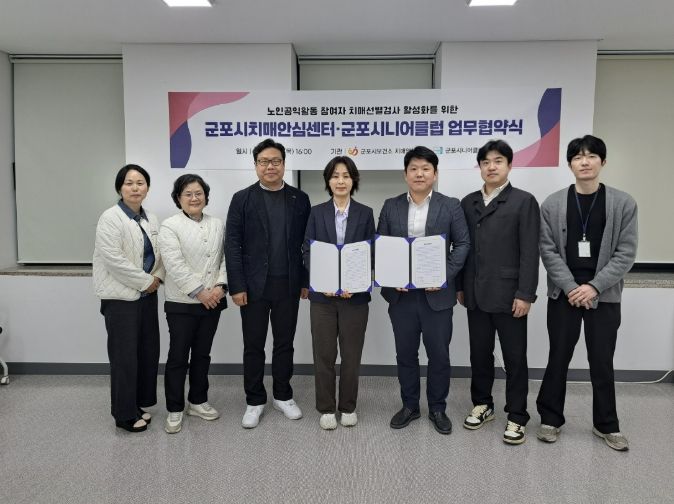 경기호연뉴스 민선기 기자 | 군포시치매안심센터는 4월 9일 군포시시니어클럽과 업무협약을 체결하고 노인공익활동 참여자를 대상으로 한 치매선별검사 확대에 나선다고 밝혔다.