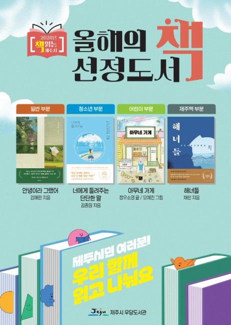 2026년 올해의 책은 총 4권으로 ▲일반 부문: 안녕이라 그랬어(김애란 저) ▲청소년 부문: 너에게 들려주는 단단한 말(김종원 저) ▲어린이 부문: 아무네 가게(정유소영 저) ▲제주책 부문: 해녀들(채헌 저)이 선정됐다.