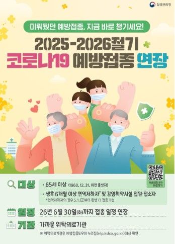 접종은 전국 위탁의료기관에서 가능하며, 가까운 접종 기관은 예방접종도우미 누리집에서 확인할 수 있다. 다만, ‘2025-2026절기 코로나19 예방접종’이 마무리 단계에 접어들면서 의료기관 일정 확인이 필요하므로 방문 전 해당 의료기관에 문의 후 방문할 것을 당부드린다.