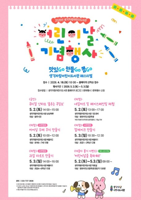 경기호연뉴스 민선기 기자 | 원주시 생각자람어린이도서관은 어린이날을 맞아 5월 2일부터 3일까지 2일간 ‘맛있GO 만들GO 뽑GO’ 페스티벌을 운영한다.