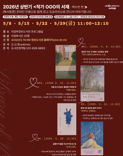 경기호연뉴스 민선기 기자 | 의정부시는 2026년 상반기 ‘작가 OOO의 서재: 백수린 편’을 5월 매주 금요일(8일, 15일, 22일, 29일) 총 4회에 걸쳐 의정부정보도서관에서 운영한다.