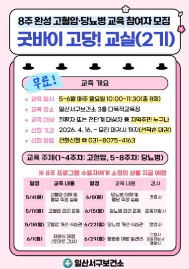 2026년 고혈압·당뇨병 교육상담 표준화 사업의 일환으로 진행되는‘굿바이 고당! 교실’은 고혈압·당뇨병 질환자 또는 전 단계 대상 등의 건강에 관심있는 지역 주민이라면 누구나 참여할 수 있다.