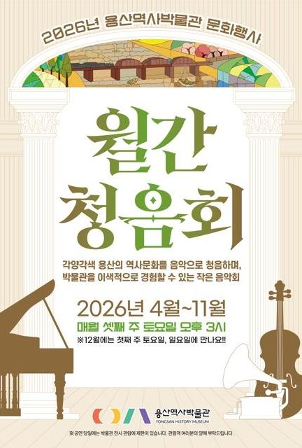 박희영 용산구청장은 “용산역사박물관 월간 청음회는 박물관을 관람하며 용산의 역사 문화를 음악으로 듣는 특별한 경험이 될 것”이라며 “매월 진행하는 공연을 통해 바쁜 일상의 지친 마음을 치유할 수 있길 바라며, 앞으로도 모두가 용산 역사문화를 즐길 수 있는 다양한 문화 향유 프로그램을 마련하겠다”라고 밝혔다.