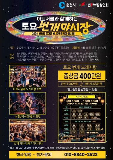시 관계자는 “번개야시장은 시민 일상 속 야간 여가 공간이자 지역 상권을 살리는 실질적인 소비 거점”이라며 “앞으로도 다양한 콘텐츠를 더해 춘천을 대표하는 야간 명소로 키워나가겠다”고 말했다.
