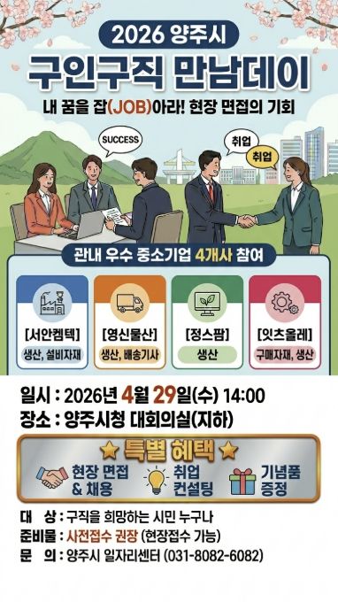 행사는 오는 4월 29일 오후 2시부터 4시까지 양주시청 대회의실에서 진행되며, 구직자는 사전 신청 또는 행사 당일 오후 1시 30분부터 현장 접수 후 면접에 참여할 수 있다. 참여를 희망하는 구직자는 이력서 등 지원 서류를 지참해야 한다.