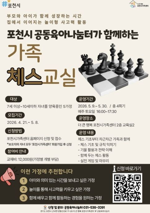 경기호연뉴스 민선기 기자 | 포천시 더 큰 행복 포천시가족센터는 공동육아나눔터 상시 프로그램의 일환으로 아동의 논리적 사고력 향상과 부모-자녀 간 긍정적 상호작용을 지원하기 위해 가족 참여형 체스 프로그램 '가족 체스 교실'을 운영한다고 밝혔다.