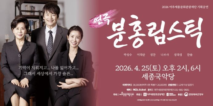경기호연뉴스 민선기 기자 | 여주세종문화관광재단이 오는 4월 25일, 예술경영지원센터의 공모사업인 '공연예술 지역 유통지원 사업'의 일환으로 베테랑 배우들이 참여한 창작 연극‘분홍립스틱’을 세종국악당에서 개최한다.