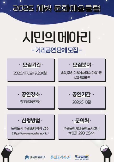 경기호연뉴스 민선기 기자 | 수원문화재단은 지역 공연예술의 활성화와 수원시민의 주체적 문화예술 참여를 위해 ‘새빛 문화예술클럽 '시민의 메아리'’ 사업에 참여할 생활예술단체를 모집한다.