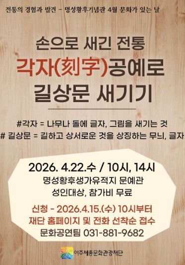 경기호연뉴스 민선기 기자 | 여주세종문화관광재단은 오는 4월 22일, 명성황후기념관 4월 문화가 있는 날 프로그램으로 '손으로 새긴 전통, 각자(刻字)공예로 길상문 새기기'를 진행한다.