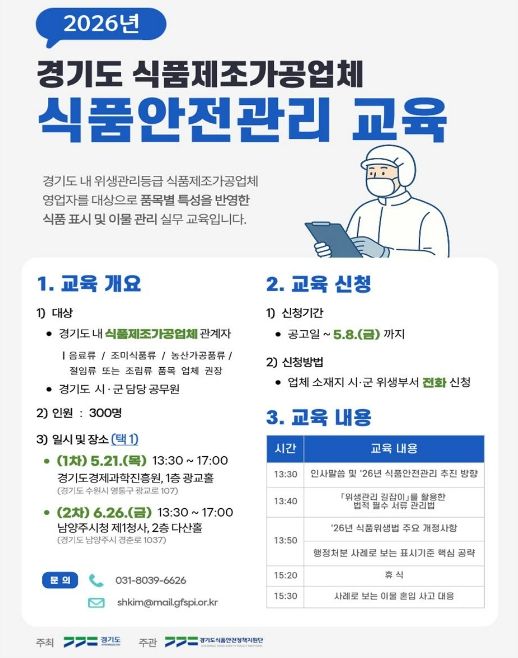 경기호연뉴스 민선기 기자 | 경기도는 도내 식품제조·가공업체의 자율적 위생관리 역량을 강화하기 위해 ‘도내 식품제조·가공업체 위생관리 교육’ 참여자를 모집한다고 20일 밝혔다.