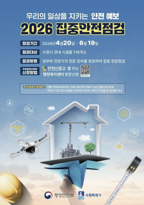 경기호연뉴스 민선기 기자 | 수원특례시가 안전사고를 예방하고, 시민의 안전 의식을 고취하기 위해 20일부터 6월 19일까지 ‘2026년 집중안전점검’을 한다.
