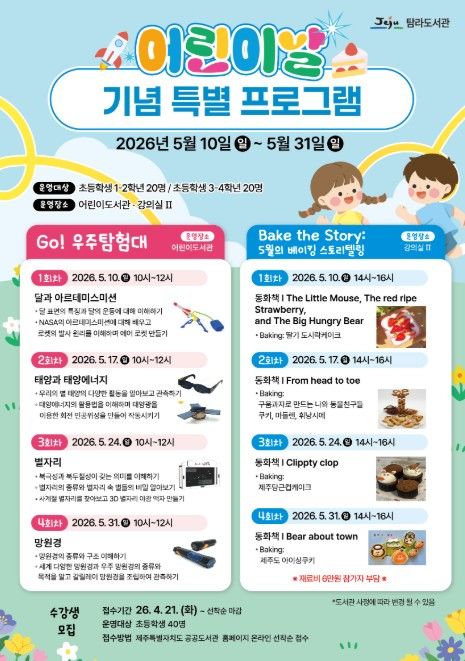 경기호연뉴스 민선기 기자 | 제주시 탐라도서관은 어린이날을 맞아 천문학과 베이킹을 주제로 한 특별 체험 프로그램을 5월 10일부터 5월 31일까지 운영한다.