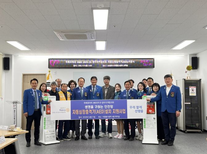 경기호연뉴스 민선기 기자 | 국제로타리 3600지구 2025-26 광주지역협의회는 지난 17일 광주시자원봉사센터 4층 교육장에서 자동심장충격기 기증식을 개최하고 500만 원 상당의 장비 2대를 전달했다.