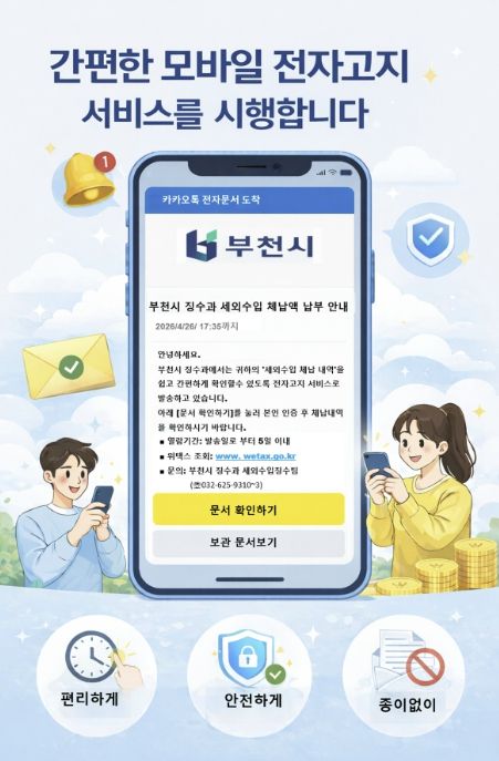 경기호연뉴스 민선기 기자 | 부천시는 이달 20일부터 시민 납세 편의를 높이고 고지서 전달의 정확성을 강화하기 위해 세외수입(일반회계) 체납안내문을 카카오톡으로 발송하는 모바일 전자고지 서비스를 시행한다.