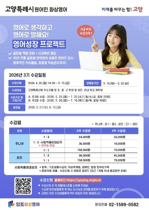 경기호연뉴스 민선기 기자 | 고양특례시는 글로벌 역량 강화와 사교육비 부담 완화를 위한 ‘원어민 화상영어’ 프로그램의 3기 수강생을 4월 20일부터 5월 15일까지 모집한다.