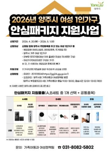 경기호연뉴스 민선기 기자 | 양주시는 관내 여성 1인 가구 등 범죄 취약 여성 가구의 안전한 일상을 지원하기 위해 ‘2026년 양주시 여성 1인 가구 안심패키지 지원사업’을 추진한다.
