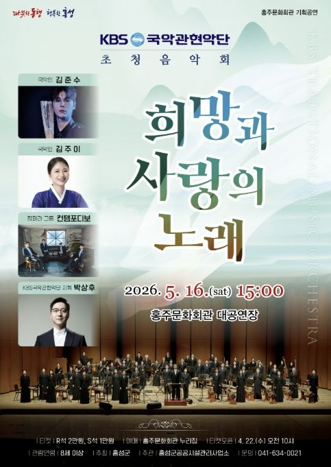 경기호연뉴스 민선기 기자 | 홍성군 홍주문화회관은 오는 5월 16일 오후 3시, 가정의 달 특별 기획으로 'KBS국악관현악단 초청음악회 - 희망과 사랑의 노래'를 무대에 올린다.