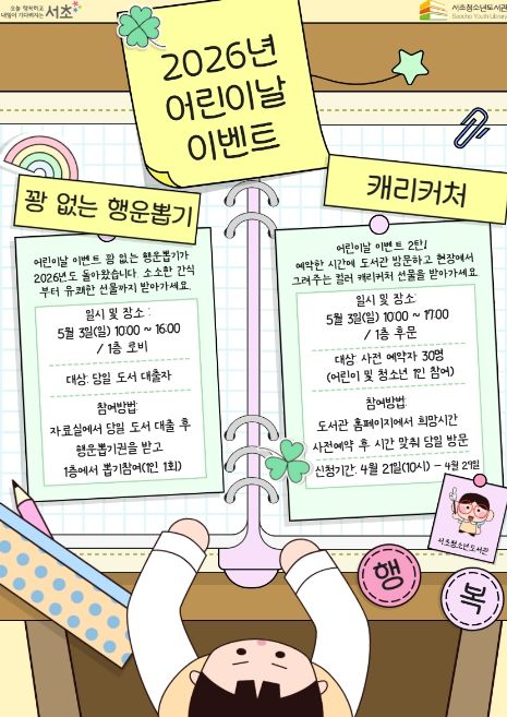 전문 작가가 현장에서 실시간으로 초상화를 그려주는 ‘컬러 캐리커처’ 이벤트도 아이들에게 특별한 추억을 선사할 예정이다. 같은 날 오전 10시부터 오후 5시까지 진행되는 캐리커처 이벤트는 사전 예약자 30명을 대상으로 진행되며, 이달 21일 오전 10시부터 서초청소년도서관 홈페이지를 통해 신청할 수 있다.