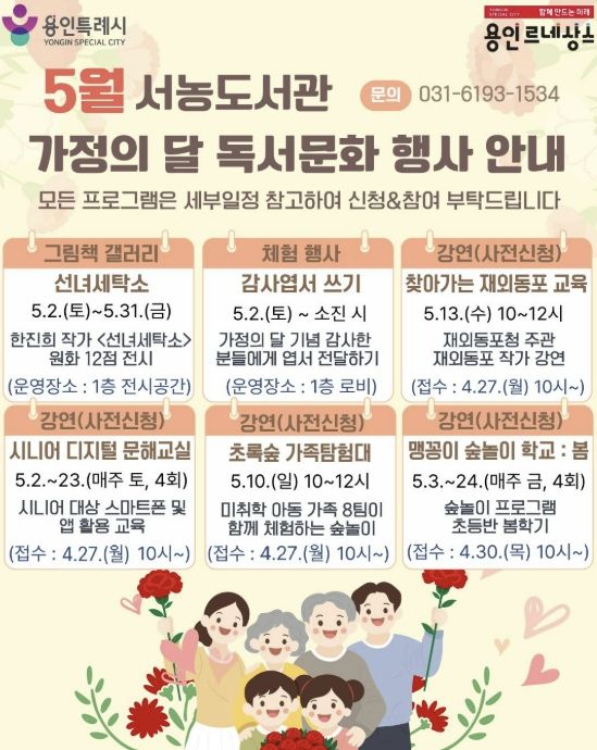 경기호연뉴스 민선기 기자 | 용인특례시 서농도서관은 오는 5월 가정의 달을 맞아 다양한 세대를 아우르는 프로그램으로 이뤄진 ‘2026년 5월 독서문화행사’를 마련했다고 21일 밝혔다.
