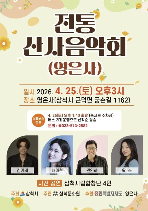 시 관계자는 “천년고찰 영은사에서 펼쳐지는 이번 음악회를 통해 시민들이 일상 속에서 문화예술을 가까이 접하고, 삼척의 전통과 자연의 가치를 함께 느끼는 시간이 되길 바란다”고 말했다.