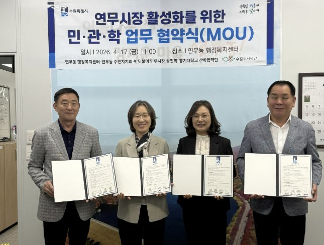 이날 협약에는 공순정 연무동장과 정경모 주민자치회장, 김윤중 반딧불이연무시장상인회장, 이주향 경기대학교 산학협력단 교수가 참석했으며, 협약의 주요 내용은 ▲연무시장 점포 환경 개선을 위한 시각디자인 제작 지원 ▲연무시장 온·오프라인 홍보 추진 ▲참여기관 행사와 연계한 공동 프로그램 운영 등으로, 상호 협력과 유기적인 협력체계 구축을 목표로 추진됐다.