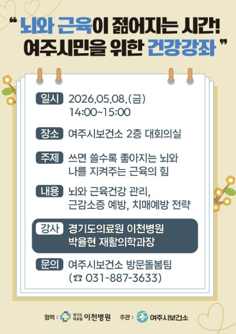 경기호연뉴스 민선기 기자 | 여주시보건소 건강증진과는 오는 5월 8일 오후 2시, 보건소 2층 대회의실에서 여주시민을 위한 건강강좌 '뇌와 근육이 젊어지는 시간!'을 개최한다고 밝혔다.