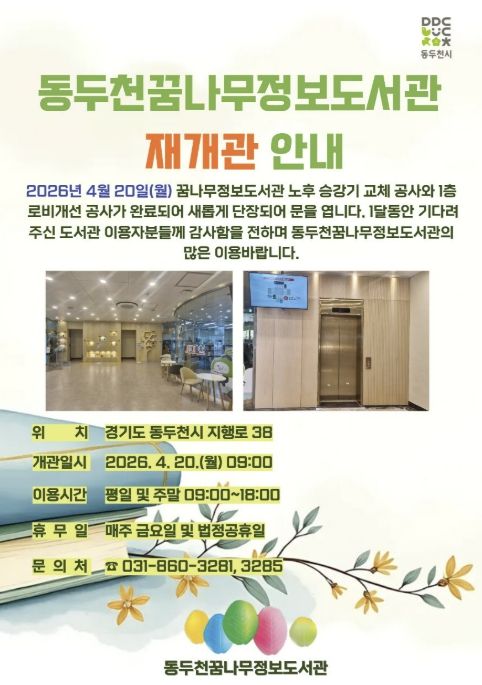 경기호연뉴스 민선기 기자 | 동두천시 도서문화사업소 꿈나무정보도서관은 이용자 편의성과 안전성 강화를 위한 승강기 교체 공사와 1층 로비 환경개선 공사를 마치고 지난 4월 20일부터 재개관했다고 밝혔다.