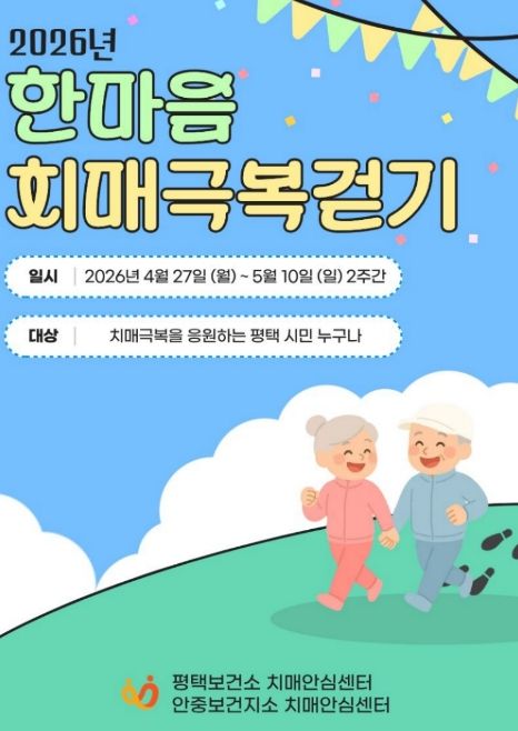 경기호연뉴스 민선기 기자 | 평택보건소 치매안심센터와 안중보건지소 치매안심센터에서는 지역 주민의 치매 예방과 인식개선을 위해 녪년 한마음 치매극복 걷기 행사’를 오는 4월 27일부터 5월 10일까지 2주간 진행한다.